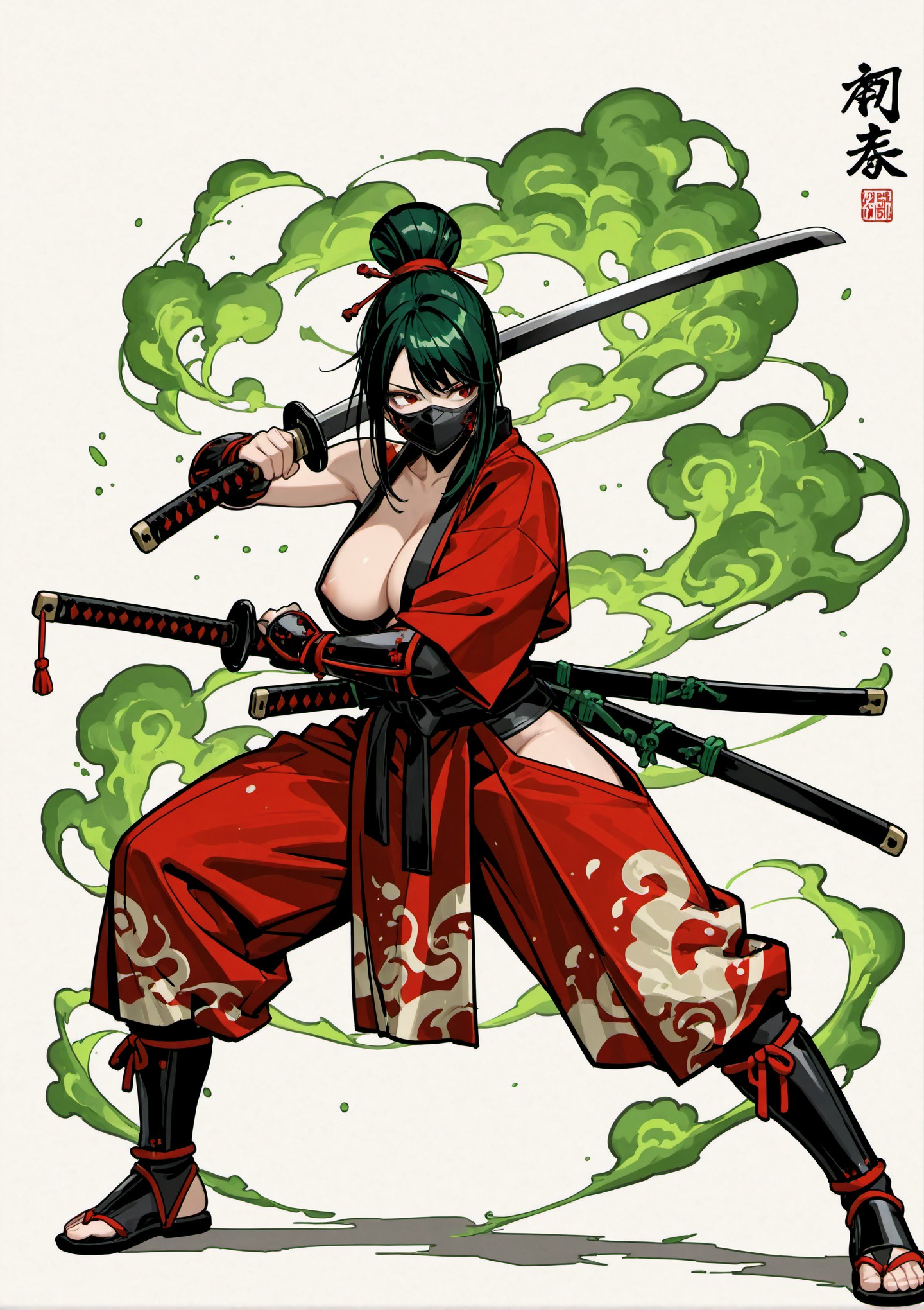 female, samurai, warrior, standing, amidst, swirling, green, smoke, is, dressed, red, kimono, style, battle, outfit, intricate, patterns, complemented, black, belt, and, arm, guards, face, mask, front, top, loose, opened, revealing, big, breasts, nipple, ninja, boots, dynamic, pose, has, defiant, Two, swords, are, sheathed, back, sword, partially, visible, warriors, hand, suggesting, readiness, hair, styled, high, bun, adding, traditional, aesthetic, background, fully, filled, vibrant, creating, dramatic, mystical, atmosphere, view, side, best, quality, details, resolution