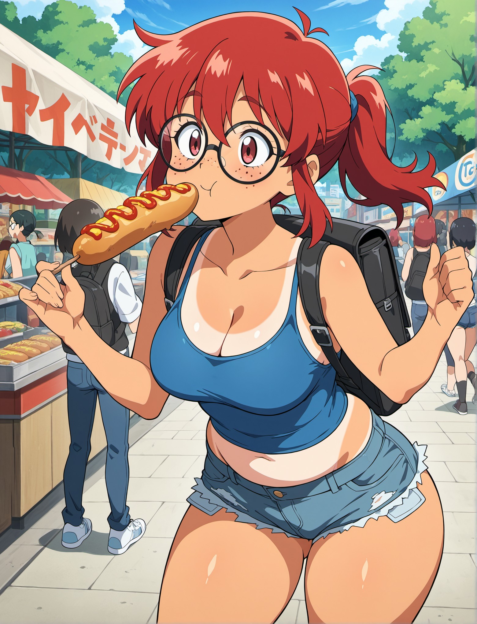 girl, round, nerd, glasses, eating, corndog, freckles, ponytail, red, hair, small, and, chubby, big, bust, cleavage, suntan, line, butts, wearing, tight, blue, tanktop, frayed, micro, denim, shorts, sneakers, black, backpack, ass, cheeks, street, is, busy, stores, crowd, food, vendors, trees, cars, dynamic, view, anime, style, uncensored, best, quality, high, details, resolution, art, digital, expressive, composition, vibrant, studio, highly, detailed
