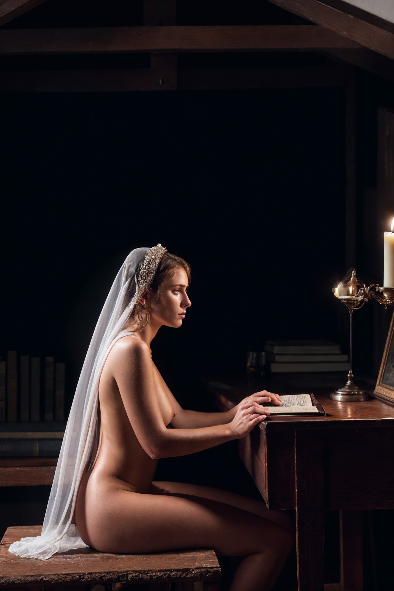 girl, full, body, art, photography, depict, naked, veil, head, praying, night, small, antique, wooden, desk, Bible, dark, candle, light, reflection, atmosphere, ambient, prayer, big, breasts, puffy, nipple, pubic, hair, sitting, garret, attic, view, front, masterpiece, best, quality, extremely, high, details, absurdres, photorealistic, realistic, hyperdetailed, raytracing, resolution, sharp, focus, vibrant, intricate, sharpness, and, clarity, lifelike, hyperrealism