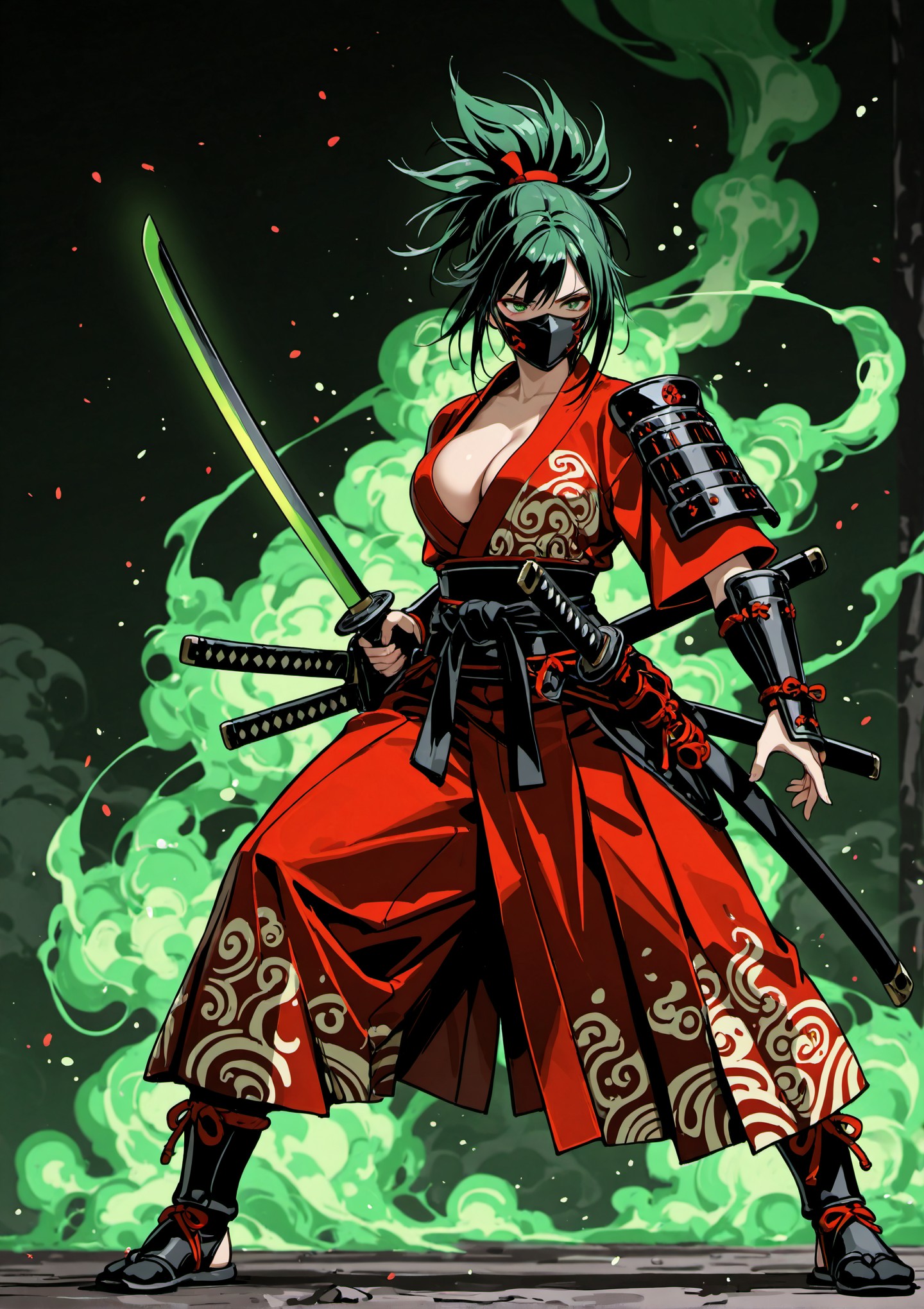 female, samurai, warrior, standing, amidst, swirling, green, smoke, is, dressed, red, kimono, style, battle, outfit, intricate, patterns, complemented, black, belt, and, arm, guards, face, mask, front, top, loose, opened, revealing, big, bust, cleavage, ninja, boots, dynamic, pose, has, defiant, Two, swords, are, sheathed, back, sword, partially, visible, warriors, hand, suggesting, readiness, hair, styled, high, bun, adding, traditional, aesthetic, background, fully, filled, vibrant, creating, dramatic, mystical, atmosphere, view, best, quality, details, resolution