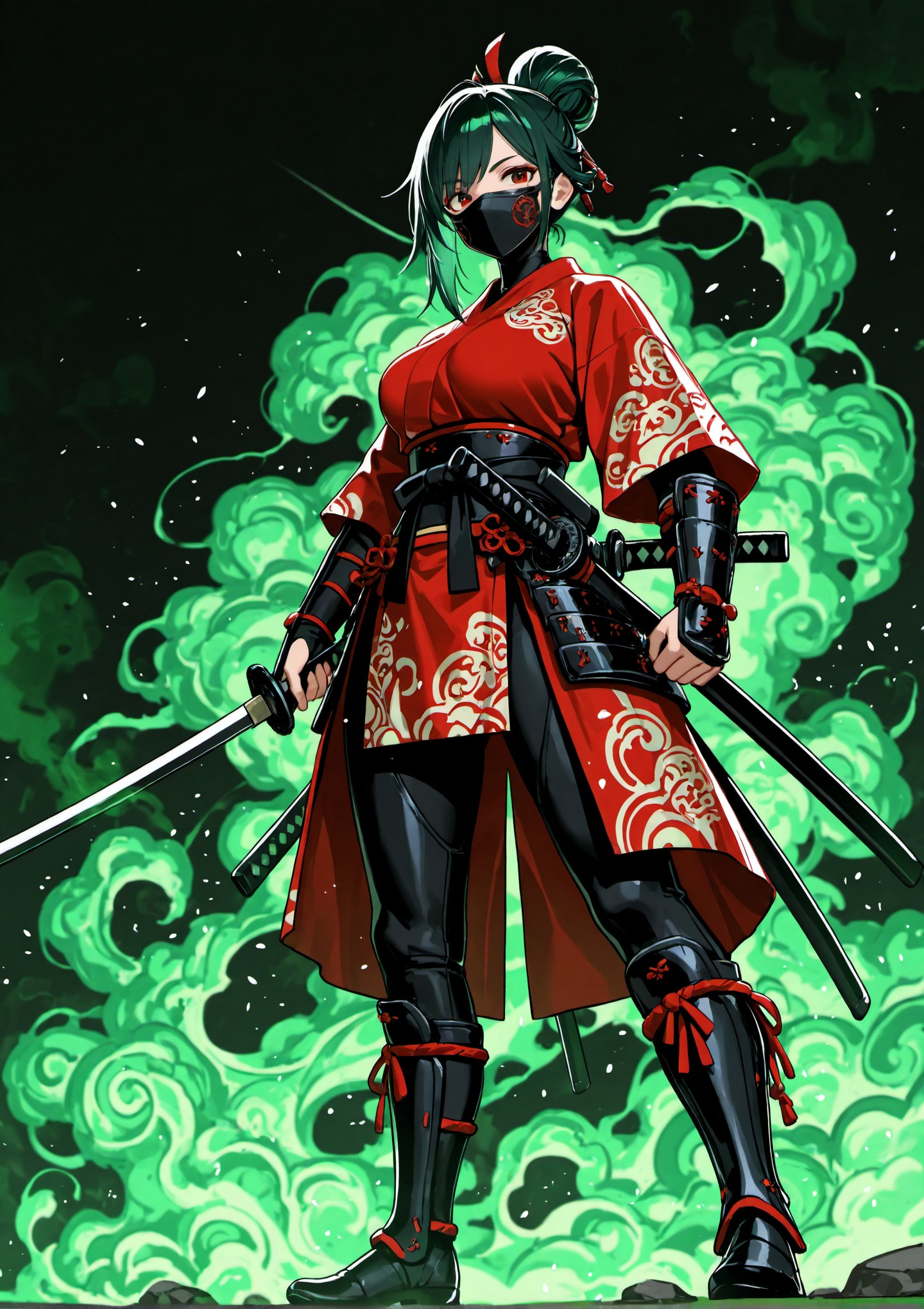 female, samurai, warrior, standing, amidst, swirling, green, smoke, is, dressed, red, kimono, style, battle, outfit, intricate, patterns, complemented, black, belt, and, arm, guards, face, mask, big, bust, ninja, boots, dynamic, pose, has, defiant, Two, swords, are, sheathed, back, sword, partially, visible, warriors, hand, suggesting, readiness, hair, styled, high, bun, adding, traditional, aesthetic, background, fully, filled, vibrant, creating, dramatic, mystical, atmosphere, view, best, quality, details, resolution