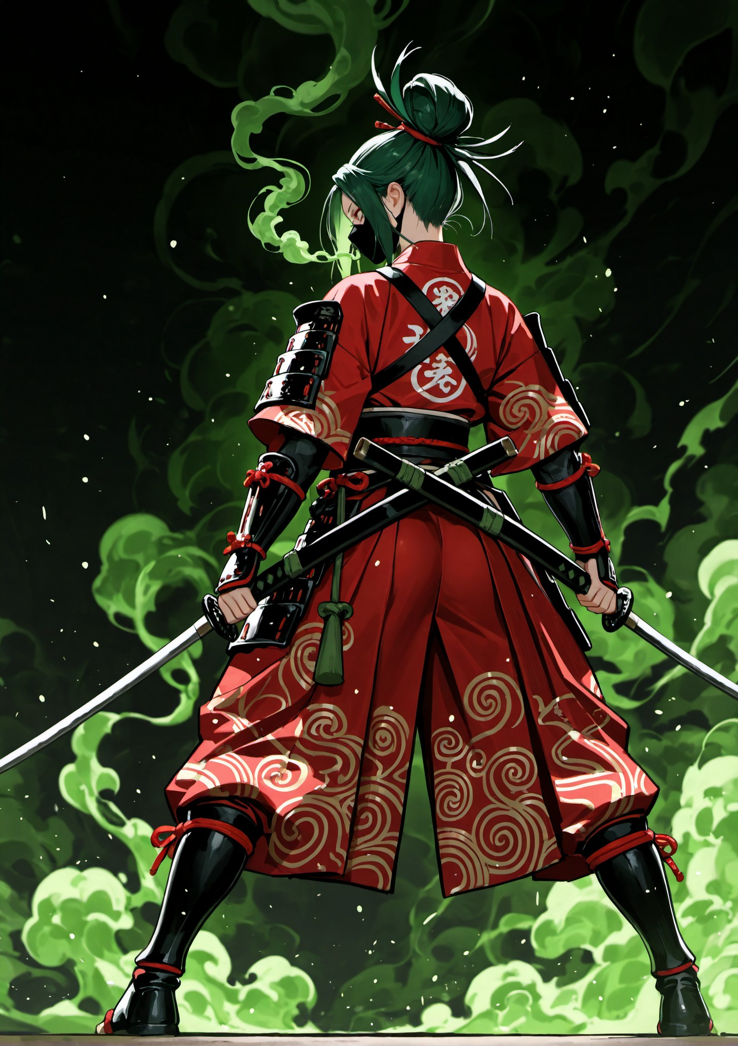 Positive Prompt a female samurai warrior standing amidst swirling green smoke. She is dressed in a red kimono style battle outfit with intricate patterns, complemented by a black belt and arm guards with a face mask. big bust, ninja boots, she is in dynamic pose and has a defiant face. Two swords are sheathed on the back, with one sword partially visible in the warrior's hand, suggesting readiness for battle. The warrior's hair is styled in a high bun, adding to the traditional samurai aesthetic. The background is fully filled with vibrant green smoke, creating a dramatic and mystical atmosphere. view from behind, (best quality:1.3), high details, high resolution
