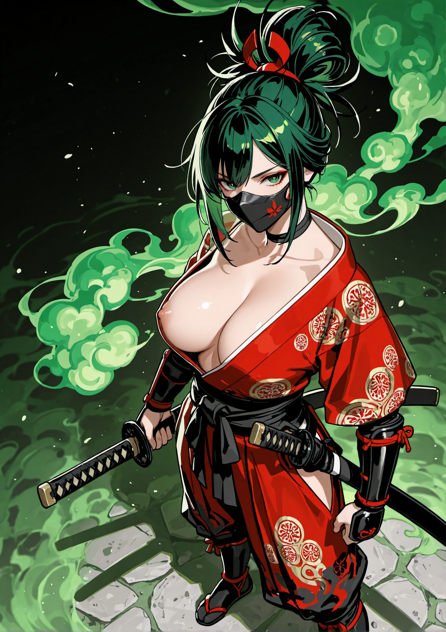 female, samurai, warrior, standing, amidst, swirling, green, smoke, is, dressed, red, kimono, style, battle, outfit, intricate, patterns, complemented, black, belt, and, arm, guards, face, mask, front, top, loose, opened, revealing, big, breasts, nipple, ninja, boots, dynamic, pose, has, defiant, Two, swords, are, sheathed, back, sword, partially, visible, warriors, hand, suggesting, readiness, hair, styled, high, bun, adding, traditional, aesthetic, background, fully, filled, vibrant, creating, dramatic, mystical, atmosphere, view, best, quality, details, resolution