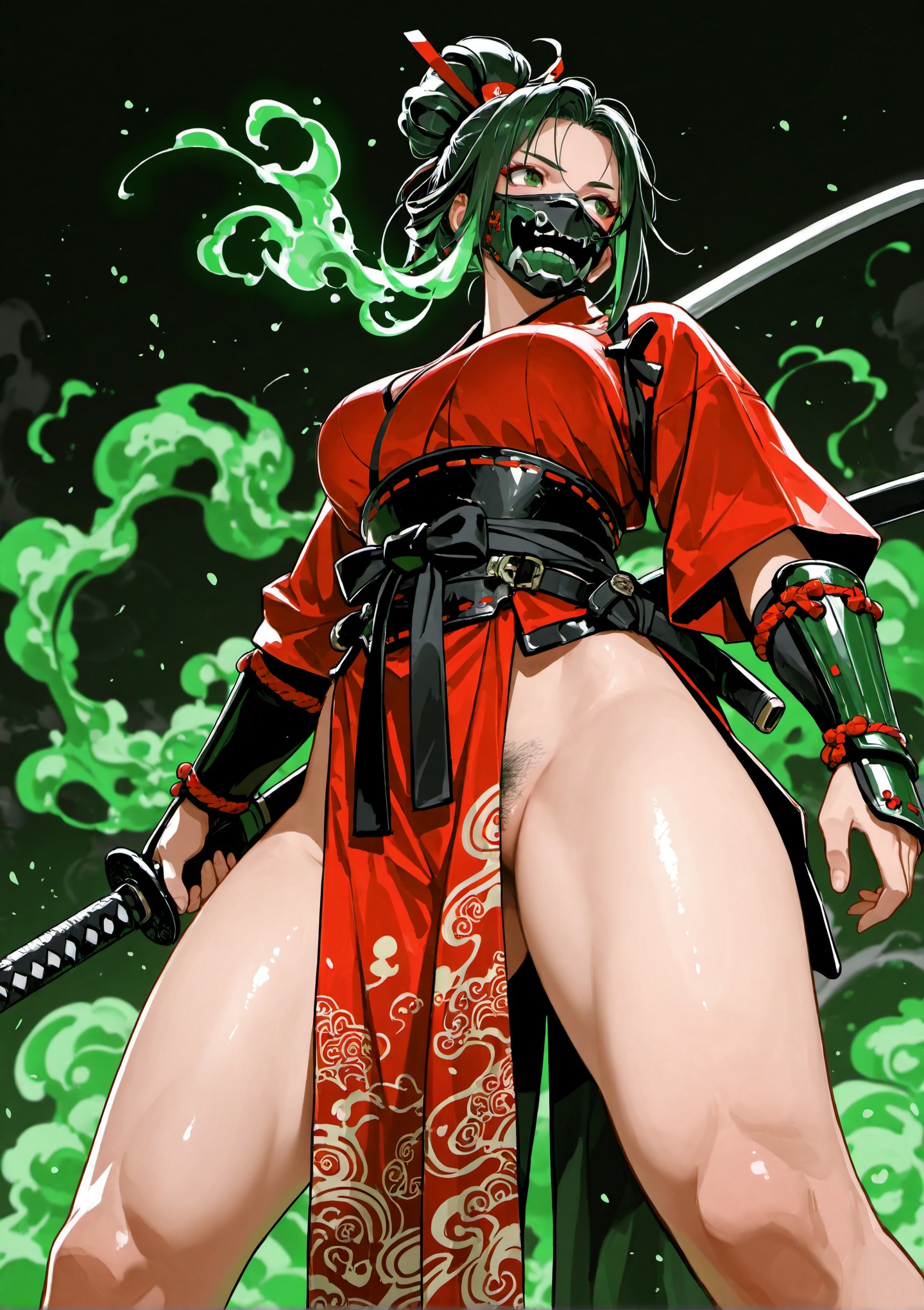 female, samurai, warrior, standing, amidst, swirling, green, smoke, is, dressed, red, kimono, style, battle, outfit, intricate, patterns, complemented, black, belt, and, arm, guards, face, mask, big, bust, having, no, underwear, bare, thighs, exposed, pubic, hair, dynamic, pose, has, defiant, Two, swords, are, sheathed, back, sword, partially, visible, warriors, hand, suggesting, readiness, styled, high, bun, adding, traditional, aesthetic, background, fully, filled, vibrant, creating, dramatic, mystical, atmosphere, view, best, quality, details, resolution
