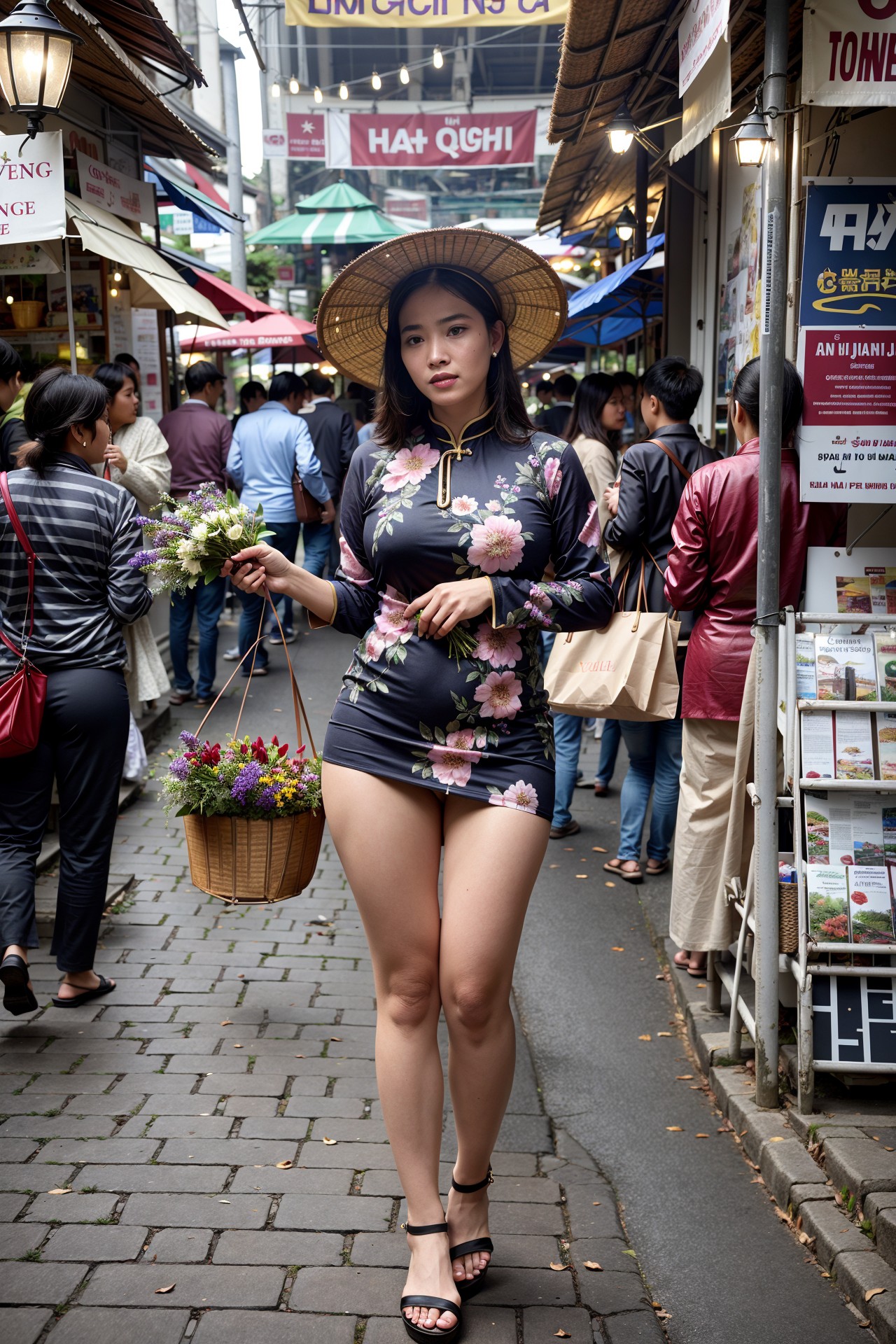 girl, full, body, Vietnamese, country, Ao, Dai, pattern, printed, vietnamese, bamboo, conical, hat, tight, short, dress, high, sideslit, thigh, busty, huge, breasts, cleavage, basket, flowers, selling, street, flower, vendor, Vietnam, outdoor, market, carrying, bunch, stems, baskets, glossy, lips, lipstick, makeup, extra, wide, hip, butts, thick, sandals, depth, field, crowd, tricycle, village, night, lights, lamps, view, masterpiece, best, quality, extremely, details, absurdres, photorealistic, realistic, hyperdetailed, raytracing, resolution, sharp, focus, vibrant, intricate, sharpness, and, clarity, lifelike, hyperrealism