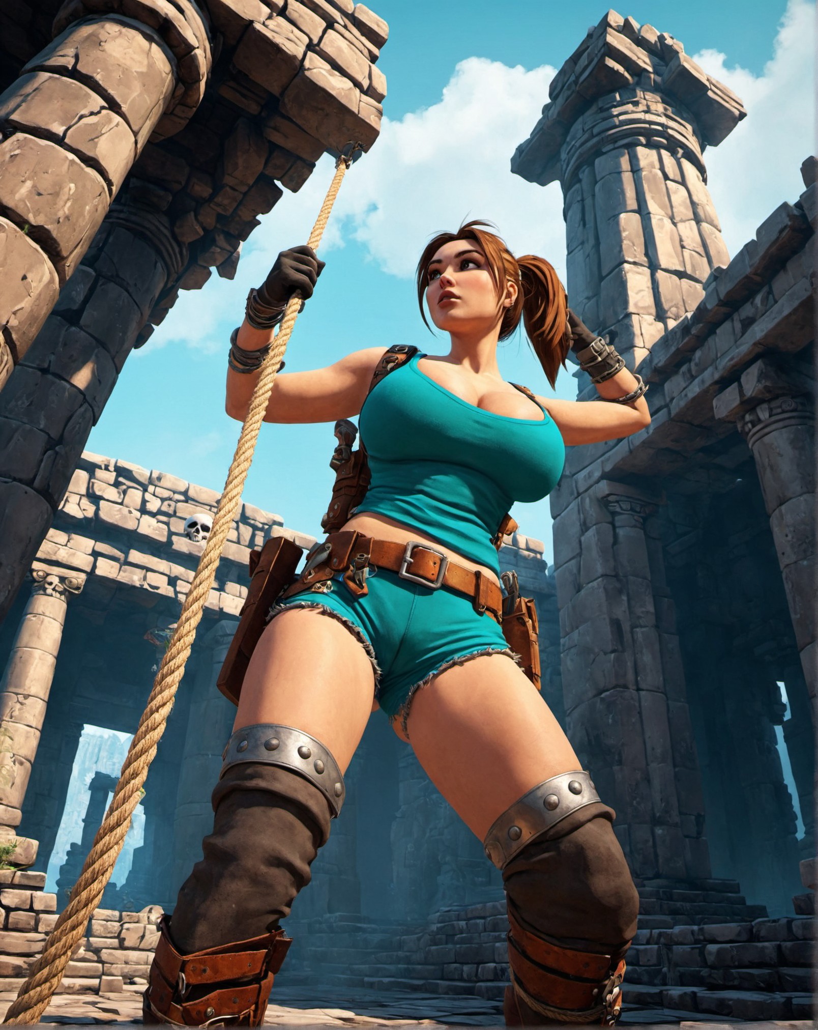 Positive Prompt a female adventurer in a teal tank top and brown frayed micro-shorts, wearing rugged knee-high boots suitable for exploration. She has a utility belt adorned with tools, holsters, and pouches. gloves, ponytail hair, big bust, cleavage, big cameltoe, thighs, glamorous body. hanging on a rope from the roof of ancient temple, The setting features ancient stone ruins, cobwebs, scattered skulls, and a dimly lit, eerie atmosphere, view from below, Game art illustration style, game illustration, diverse and immersive visuals, whimsical, dynamic characters and environments, rich color palettes, enhances storytelling and gameplay experience