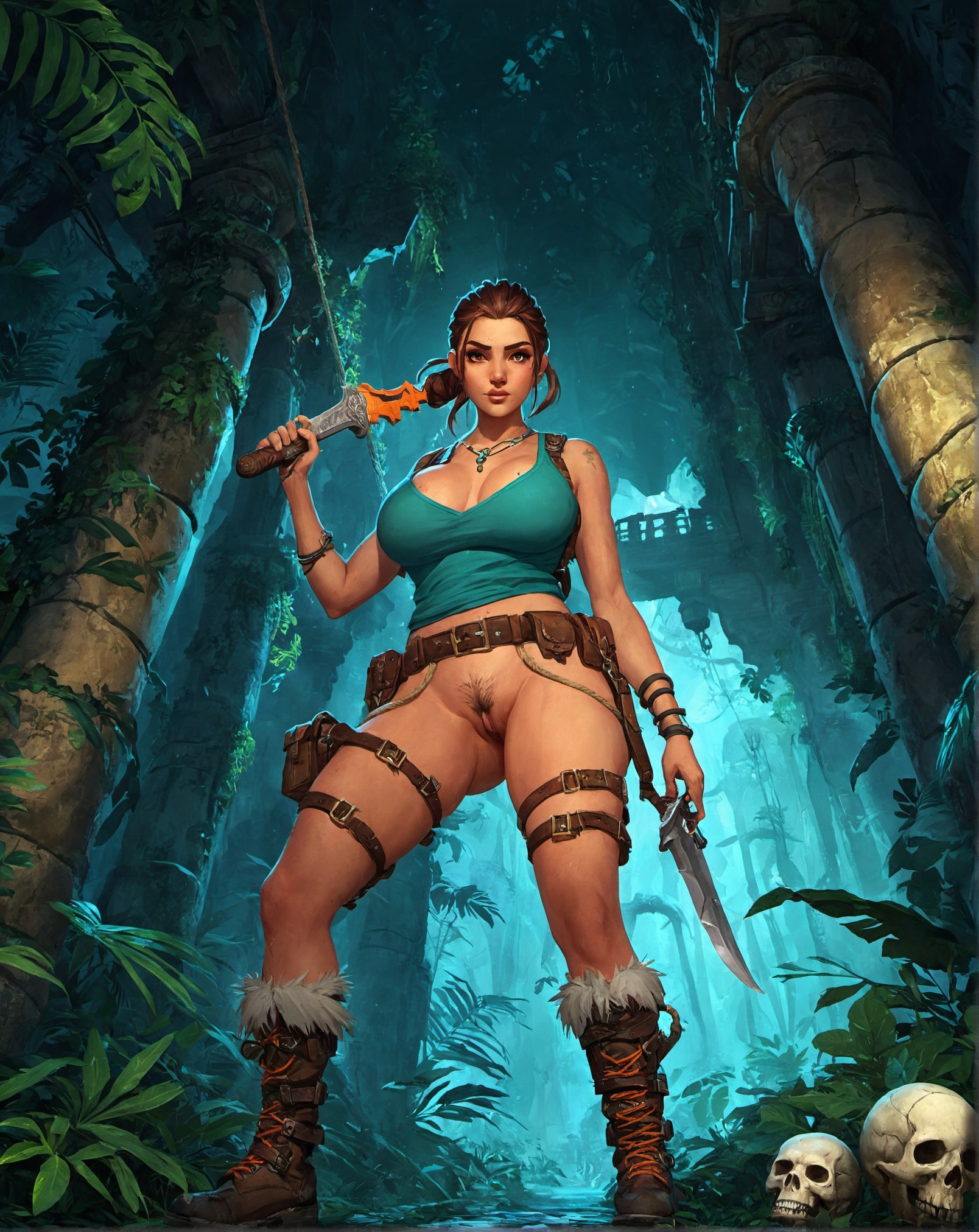 Positive Prompt a female adventurer in a teal tank top and bottomless, pubic hair, pussy, wearing rugged knee-high boots suitable for exploration. She has a utility belt adorned with tools, holsters, and pouches. carrying a jungle knife in one hand, ponytail hair, torn shirt exposing big breasts partially, cleavage, big cameltoe, thighs, glamorous body. hanging on a rope from the roof of ancient temple, The setting features deep jungle, cobwebs, scattered skulls, and a dimly lit, eerie atmosphere, view from below, Game art illustration style, game illustration, diverse and immersive visuals, whimsical, dynamic characters and environments, rich color palettes, enhances storytelling and gameplay experience