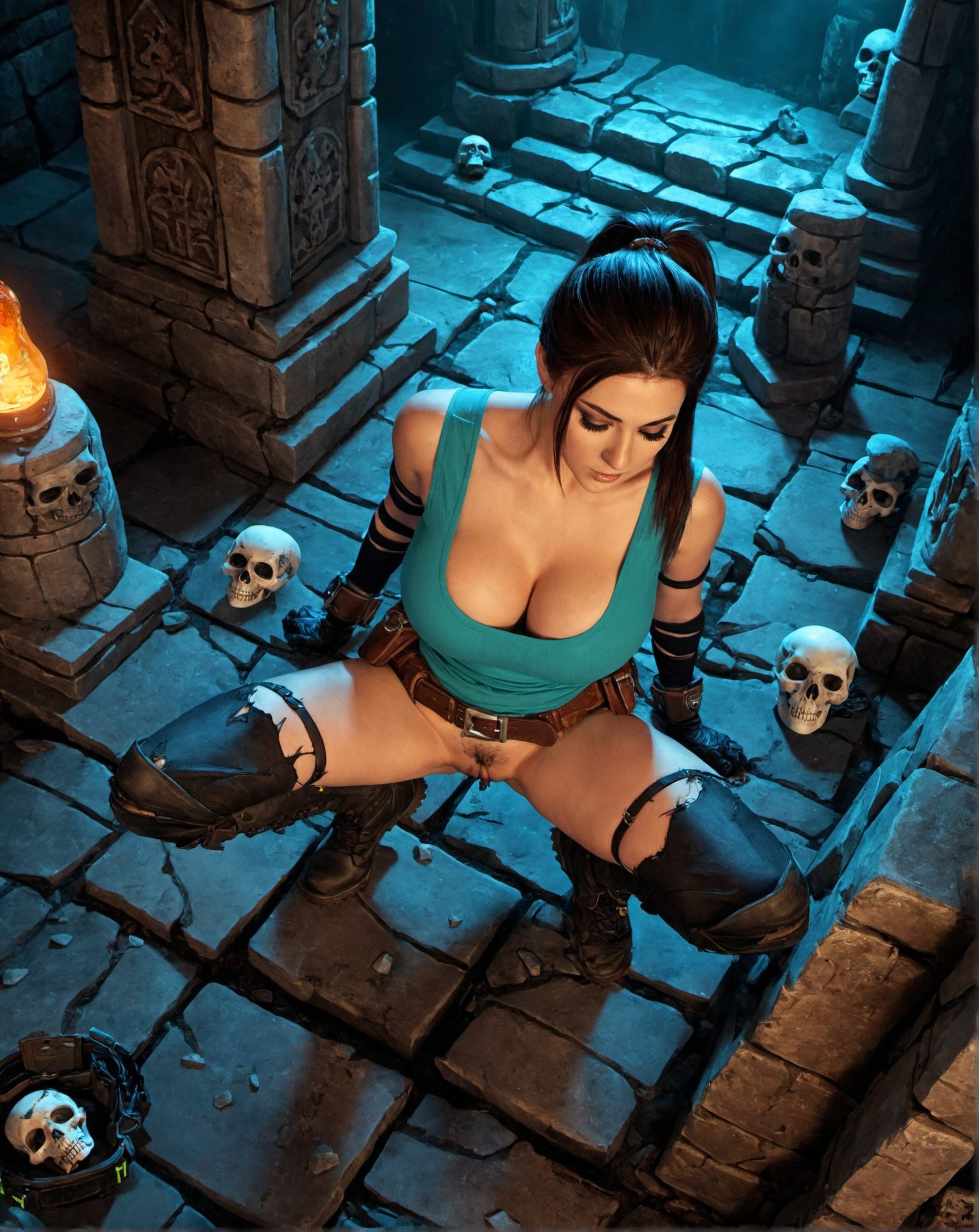 female, adventurer, teal, tank, top, and, bottomless, pubic, hair, pussy, wearing, rugged, kneehigh, boots, suitable, exploration, has, utility, belt, adorned, tools, holsters, pouches, gloves, ponytail, torn, shirt, exposing, big, breasts, partially, cleavage, cameltoe, thighs, glamorous, body, squatting, setting, features, ancient, temple, cobwebs, scattered, skulls, dimly, lit, eerie, atmosphere, view, Game, art, illustration, style, game, diverse, immersive, visuals, whimsical, dynamic, characters, environments, rich, color, palettes, enhances, storytelling, gameplay, experience