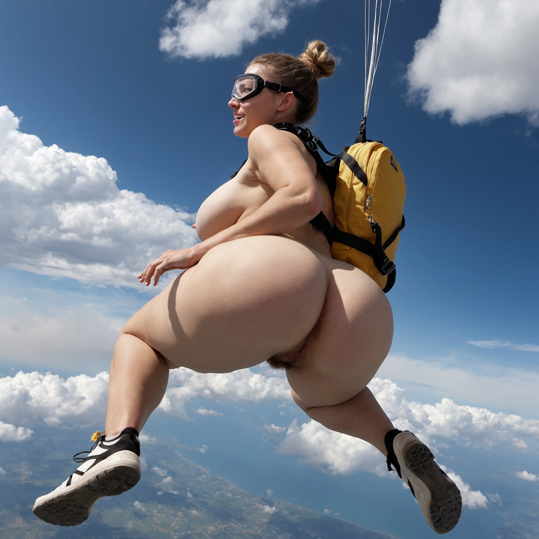 Positive Prompt a naked woman descending from the sky while free skydiving in the air, wearing yellow backpack, goggles, high bun hair, big boobs, pubic hair, pussy, asses, thick thigh, shoes, sky, clouds, dynamic pose, dynamic view, (best quality:1.3), extremely high details, (photorealistic), high resolution