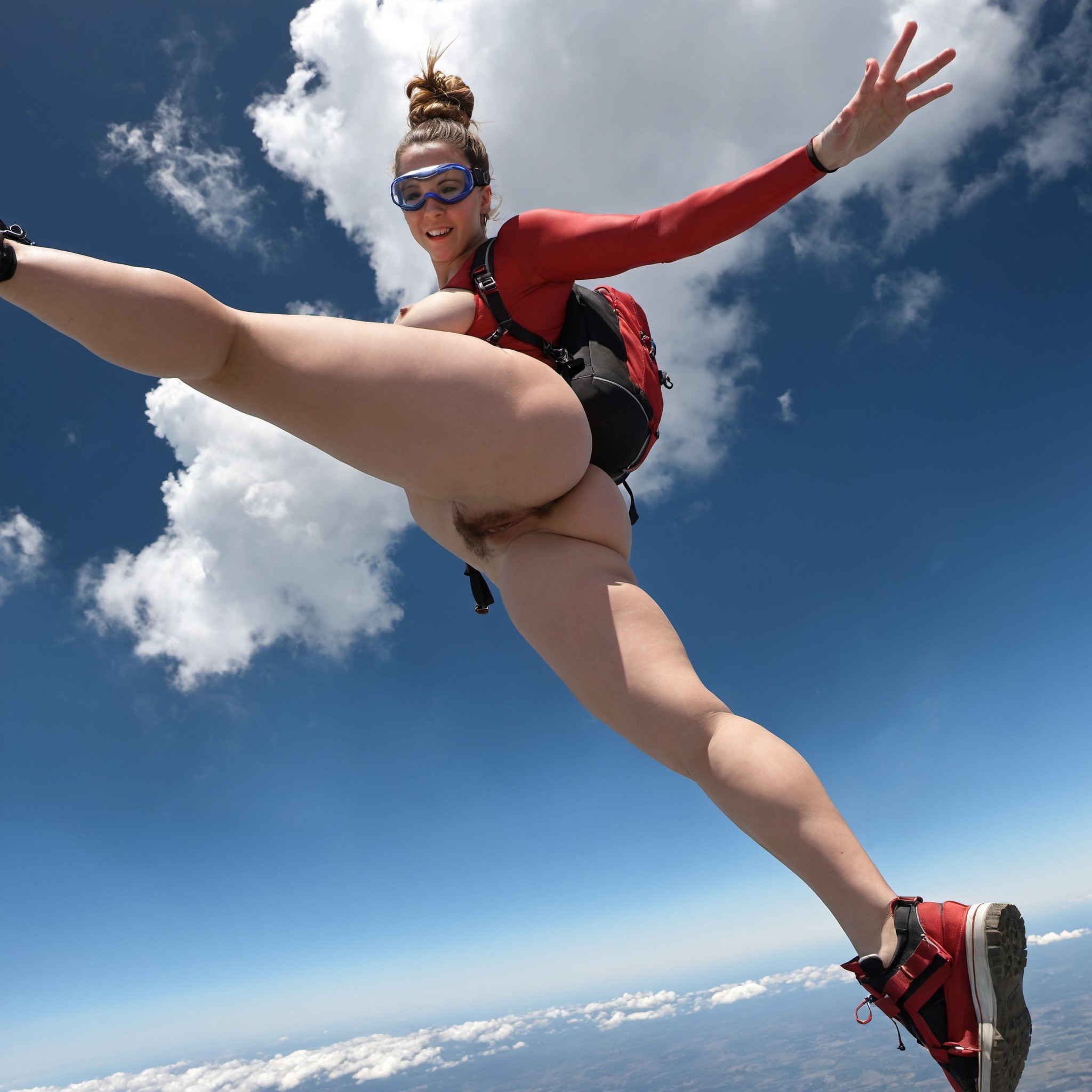 naked, woman, descending, sky, while, free, skydiving, air, wearing, red, backpack, goggles, high, bun, hair, big, boobs, pubic, pussy, asses, thick, thigh, shoes, clouds, dynamic, pose, view, best, quality, extremely, details, photorealistic, resolution